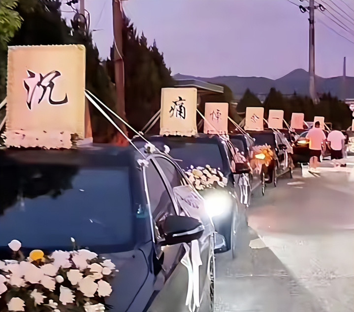 从网友曝光的画面当中,我们能够看出来负责出殡的车辆几乎都是迈巴赫,头车的车顶放着孟再平的遗照,而剩下的车的车顶也全都摆放着一个字,合起来就是“沉痛悼念,一路走好”,在汽车的侧面,还贴这“沉痛悼念孟再平千古”的横幅。