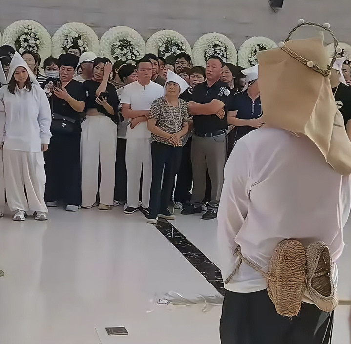 在灵堂内,孟再平的儿子头上戴着草帽,后背也挎着一个草鞋,这是当地人在亲人离世后的传统习俗,而这样穿着的人大都是死者的儿子。
