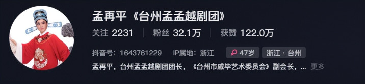 等到慢慢有了名声后,孟再平在2019年创办了台州孟孟越剧团,担任团长,为了增加知名度,孟再平还专门注册了自己的抖音账号,凭借一个梁祝的演唱片段就收获了将近5万的点赞,账号也已经有超过30万的粉丝。