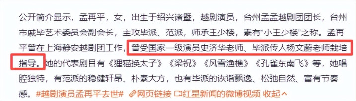 在《山伯临终》这场戏上,孟老师唱的一句“染成疾病难挽回”,成了她最后的写照,孟再平老师的离去是越剧界的重大损失,愿她此行一路走好。