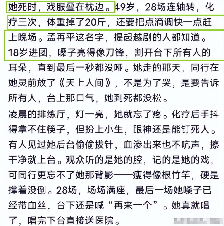 为了赶晚场,她把点滴拨快,尽管手抖的拿不住筷子,但舞台上那犀利的眼神依然被大家记得,28场演出连轴转,尽管胰腺癌夺走了她的生命,但她的身影会被大家记住,时不时的回看她在台上的演出。