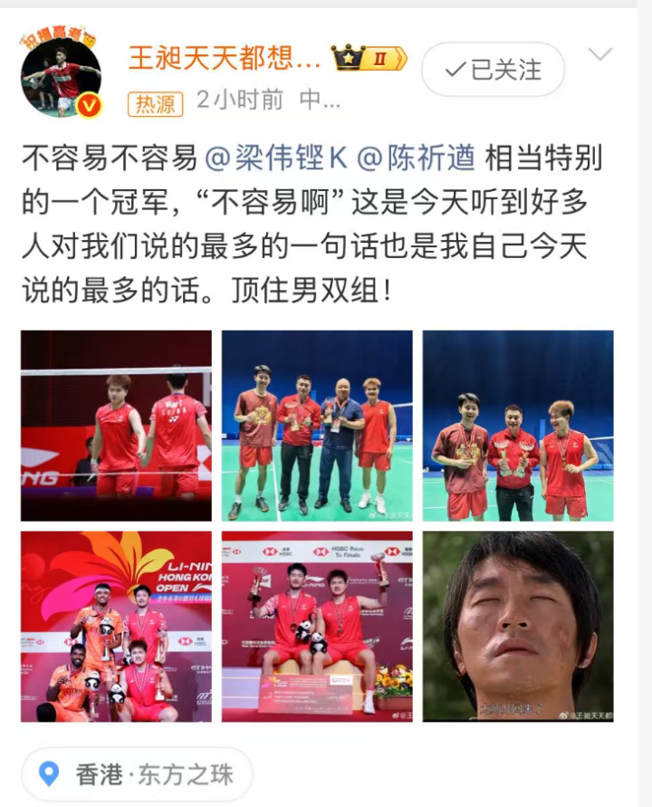 王昶连说三个不容易:不容易不容易@梁伟铿K@陈祈遒相当特别的一个冠军,“不容易啊”这是今天听到好多人对我们说的最多的一句话也是我自己今天说的最多的话。顶住男双组!