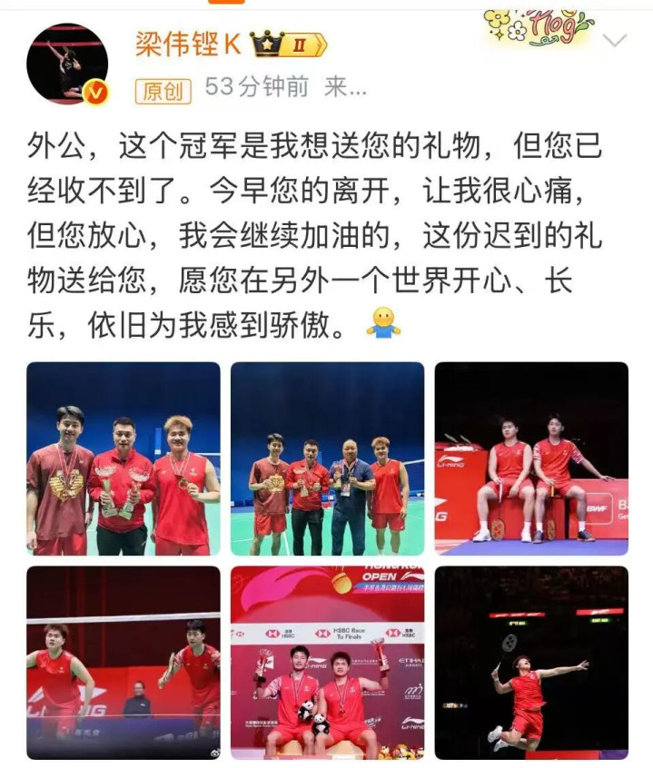 外公,这个冠军是我想送您的礼物,但您已经收不到了。今早您的离开,让我很心痛,但您放心,我会继续加油的,这份迟到的礼物送给您,愿您在另外一个世界开心、长乐,依旧为我感到骄傲。