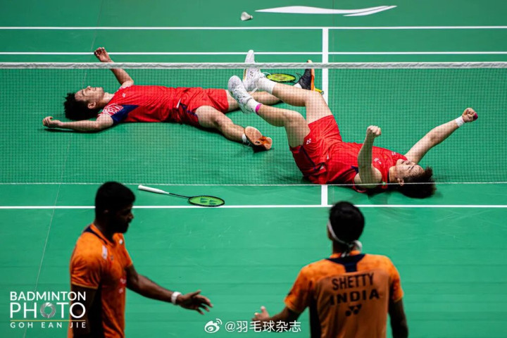 夺冠之后,王昶、梁伟铿激动得抛掉球拍躺倒了地上,久久不愿起来。