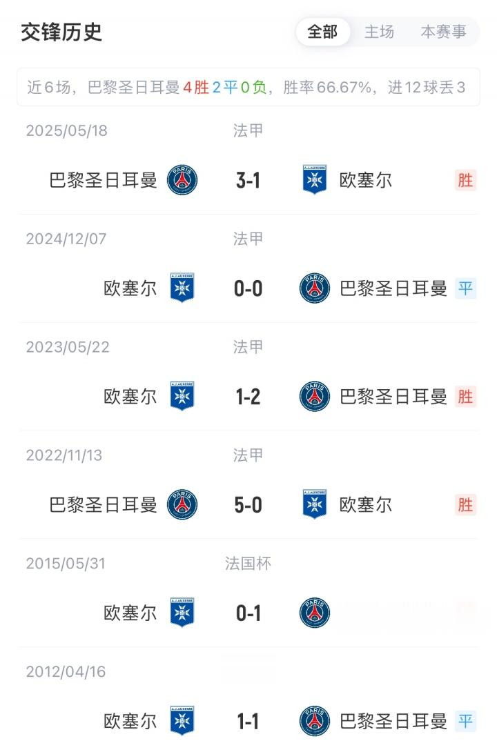积分榜方面,巴黎4胜1负积12分,上轮0-1落败马赛;欧塞尔2胜3负积6分,上轮1-0战胜图卢兹。巴黎历史对阵欧塞尔已连续7场不败(5胜2平)。