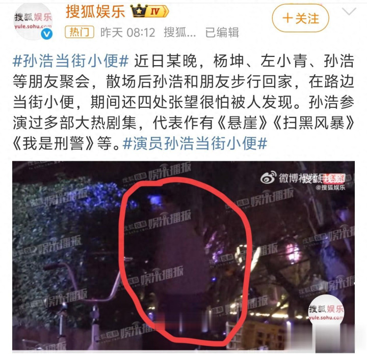 有人拍到杨坤、左小青、孙浩等人聚餐,杨坤、左小青各自和现场朋友告别后,孙浩和朋友步行回家,孙浩就被拍到在人来人往的大街上当众解手,他还四处张望有没有人看到,这个反应很明显他也知道是不对的。