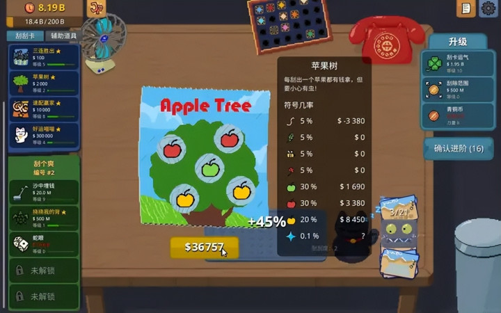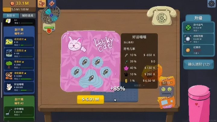 相对应的,游戏还会解锁更多辅助道具,以及装饰和成就,基础能力的升级也会逐级放开。这时候,真·全自动刮刮乐也就不难实现了。而且到这一步,游戏的乐趣也逐步往挂机游戏的方向倾斜。