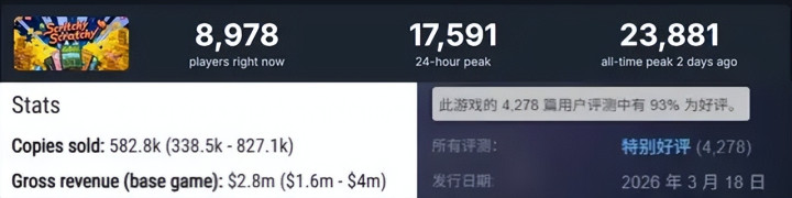 这款游戏自3月18号发售,到4月1日刚好两周的时间里,第三方平台预估其销量为58万套,总收入达到280万美金(折合人民币约1920万元),同时在线人数峰值超过了23800。