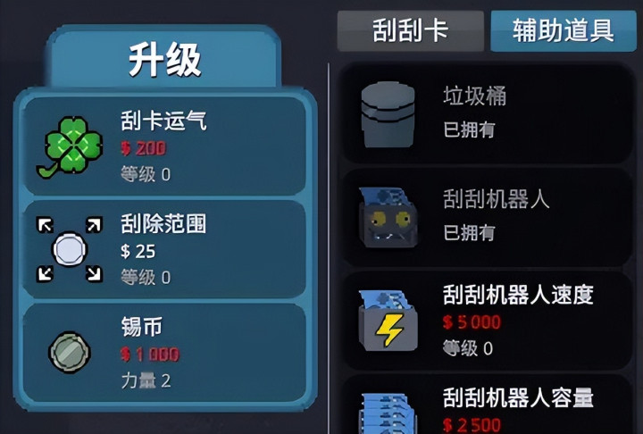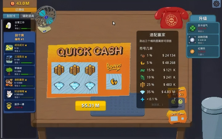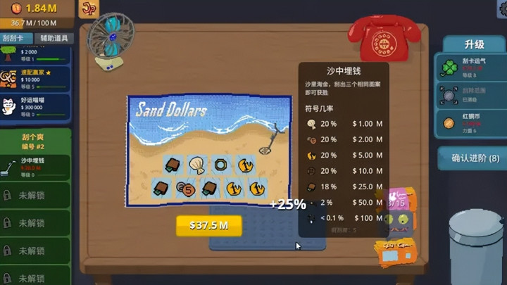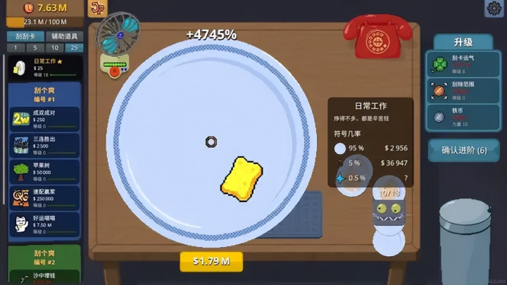 升级运气能够直观地增加中奖率,增加范围和力量可以更快刮完一张奖票,赚钱效率大幅提升。解锁和升级刮奖机、吹风机,更是可以解放玩家双手,自动赚钱。