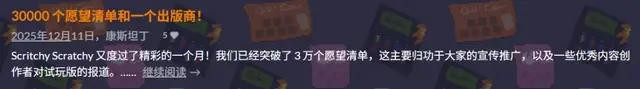 团队制作的《刮个爽》,原本是独立游戏平台itch.io的参赛作品,因为人气不错,在去年8月初转正。后来在12月,游戏Steam愿望单达到30000,同时被丹麦老牌独游厂商Funday Games看重并负责发行。
