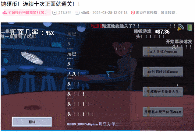 纯数学角度,这个目标几乎无法达成,但游戏里可以抛硬币赚钱,再慢慢升级概率和效率。于是,偶尔运气爆棚的连续正面,配合游戏里时不时的骚话,节目效果就有了。