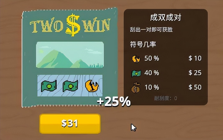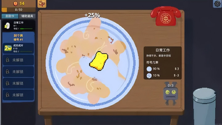 之前的擦盘子相当于一个教程,用一个小场景,引导玩家体验了“花钱购买盘子/彩票→擦干净/刮开遮蔽图层→赚钱/赔钱”这套流程。某种意义上,脏盘子属于回报率极低、回报效率慢、小概率会连本带利亏损的“变相刮刮乐”。