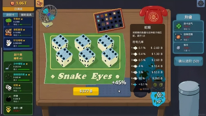 进入二周目后,有局外养成的快速启动,游戏刮奖赚钱的效率会随养成进度提升,同时解锁更多种类的刮刮乐。其中有新鲜的玩法,也有之前几种玩法的拓展形态。