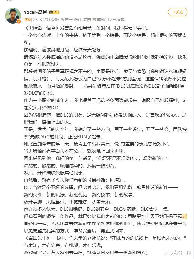 先说坏消息,大伙心心念念的《黑神话:悟空》DLC,没了。更严谨一点说,是暂时搁置了,可能几年后才会出现。
