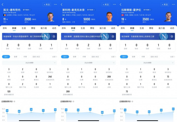 新赛季意甲,德布劳内3场2球、麦克托米奈3场1球、霍伊伦首秀破门,帮助卫冕冠军那不勒斯3连胜领跑意甲。