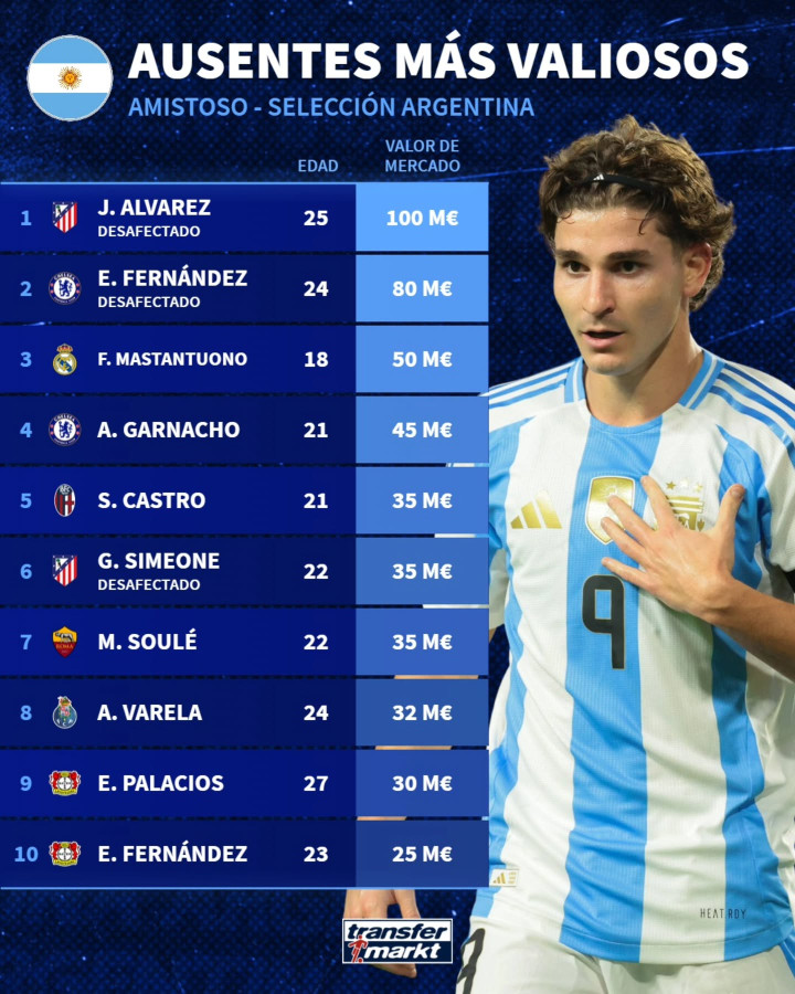 虎扑11月12日讯德国转会市场盘点了落选本期阿根廷国家队的球员,并按照身价进行了排名: