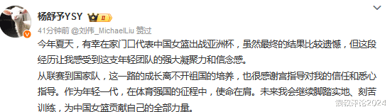 杨舒予发文表示:今年夏天,有幸在家门口代表中国女篮出战亚洲杯,虽然最终的结果比较遗憾,但这段经历让我感受到这支年轻团队的强大凝聚力和信念感。