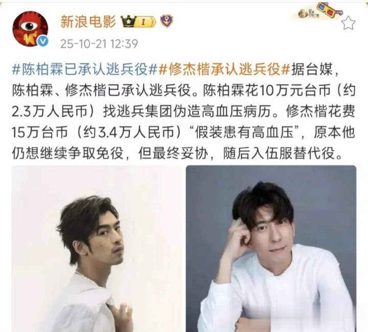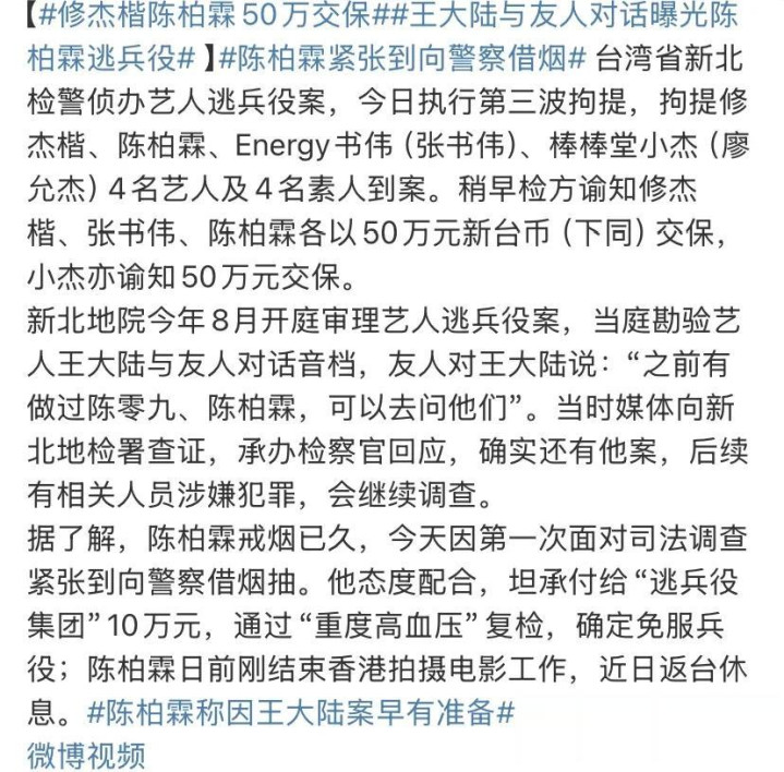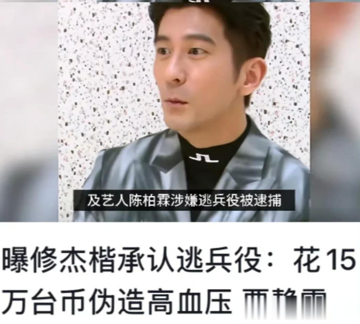 在被带回警局没多久,陈柏霖和修杰楷便承认了逃兵役的事实,陈柏霖花费10万台币伪造高血压病例,修杰楷花费15万台币假装患高血压。
