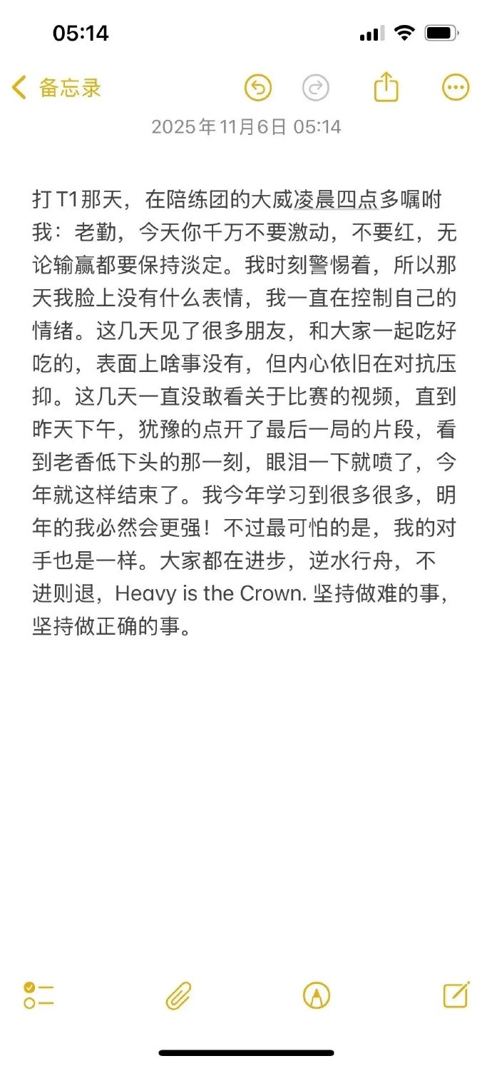 打T1那天,在陪练团的大威凌晨四点多嘱咐我:老勤,今天你千万不要激动,不要红,无论输赢都要保持淡定。我时刻警惕着,所以那天我脸上没有什么表情,我一直在控制自己的情绪。这几天见了很多朋友,和大家一起吃好吃的,表面上啥事没有,但内心依旧在对抗压抑。